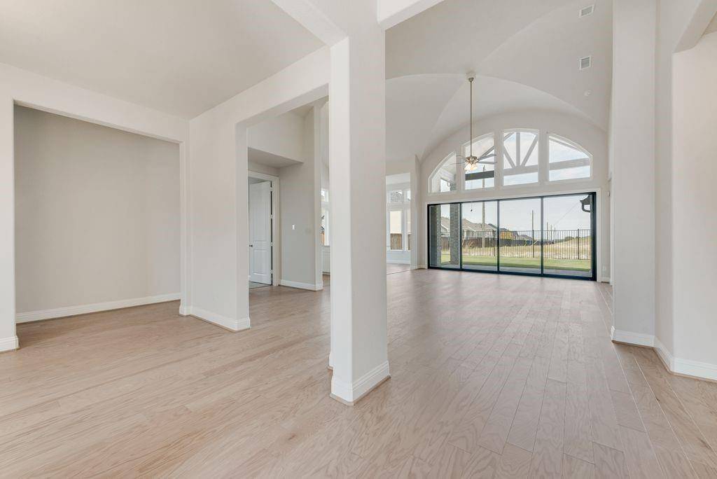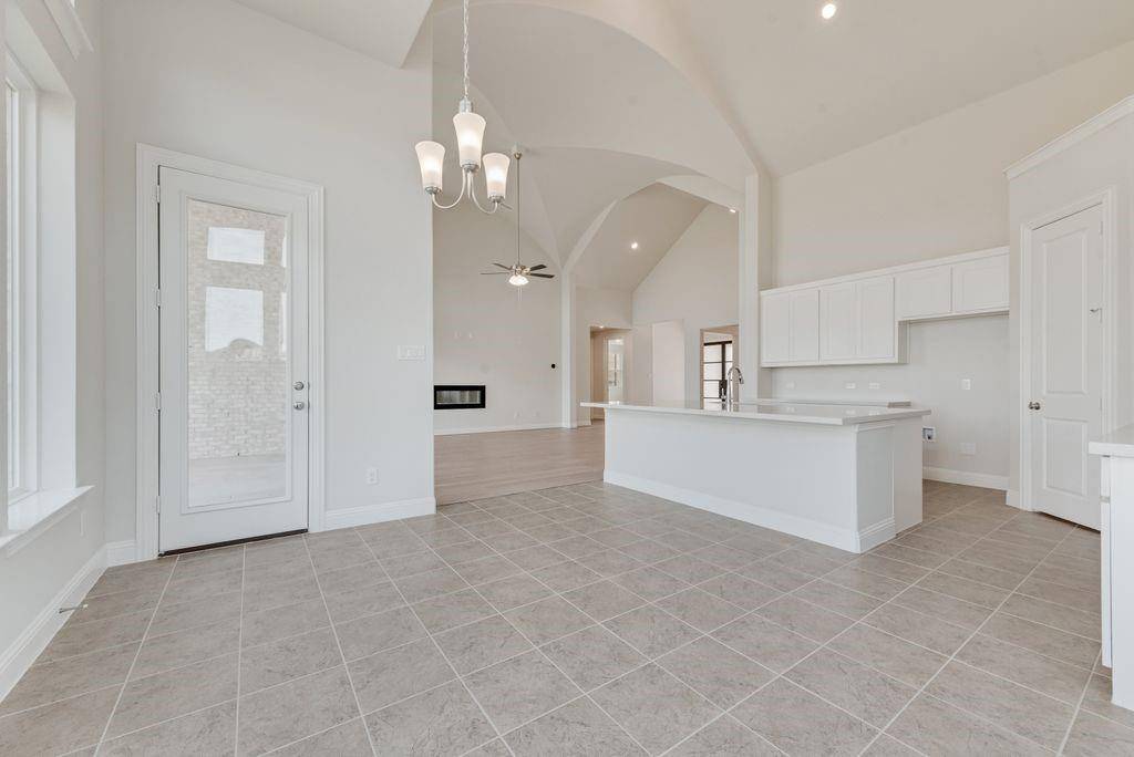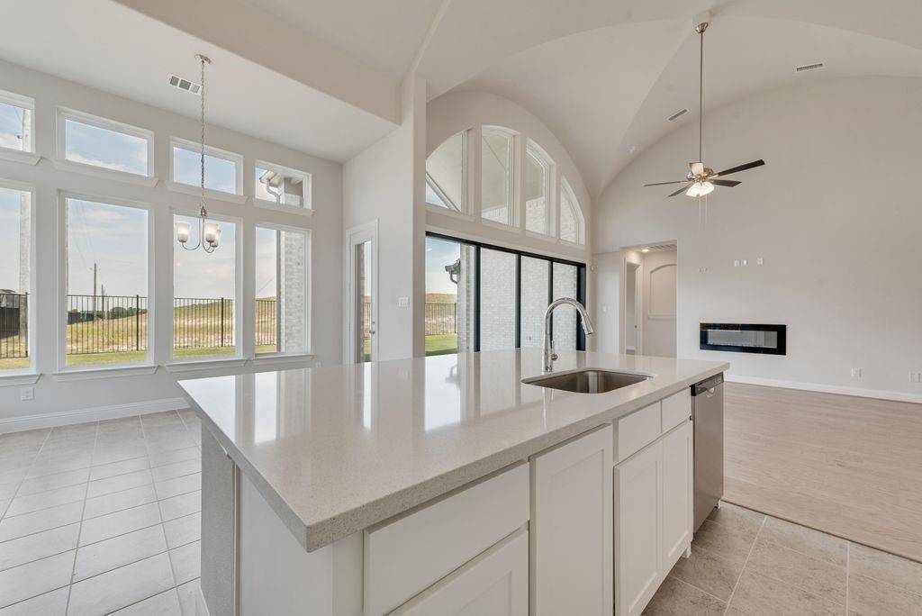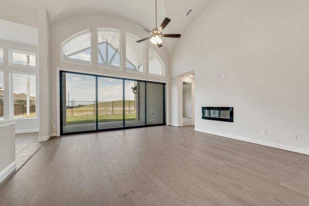 A striking double-door entry welcomes you into a thoughtfully designed open-concept layout featuring three generously sized bedrooms and elevated architectural details throughout. The dramatic groin-vaulted family room serves as the heart of the home, highlighted by a sleek 48-inch linear fireplace and expansive sliding glass doors that extend your living space to a covered patio — perfect for entertaining or relaxing outdoors.