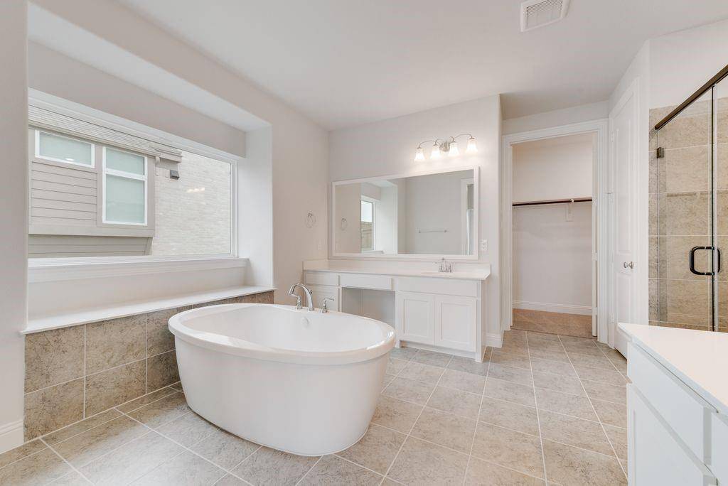 The primary suite is a luxurious sanctuary featuring a soaring cathedral ceiling, freestanding soaking tub, dual vanities with modern rectangular sinks, a tiled walk-in shower, and an oversized walk-in closet.