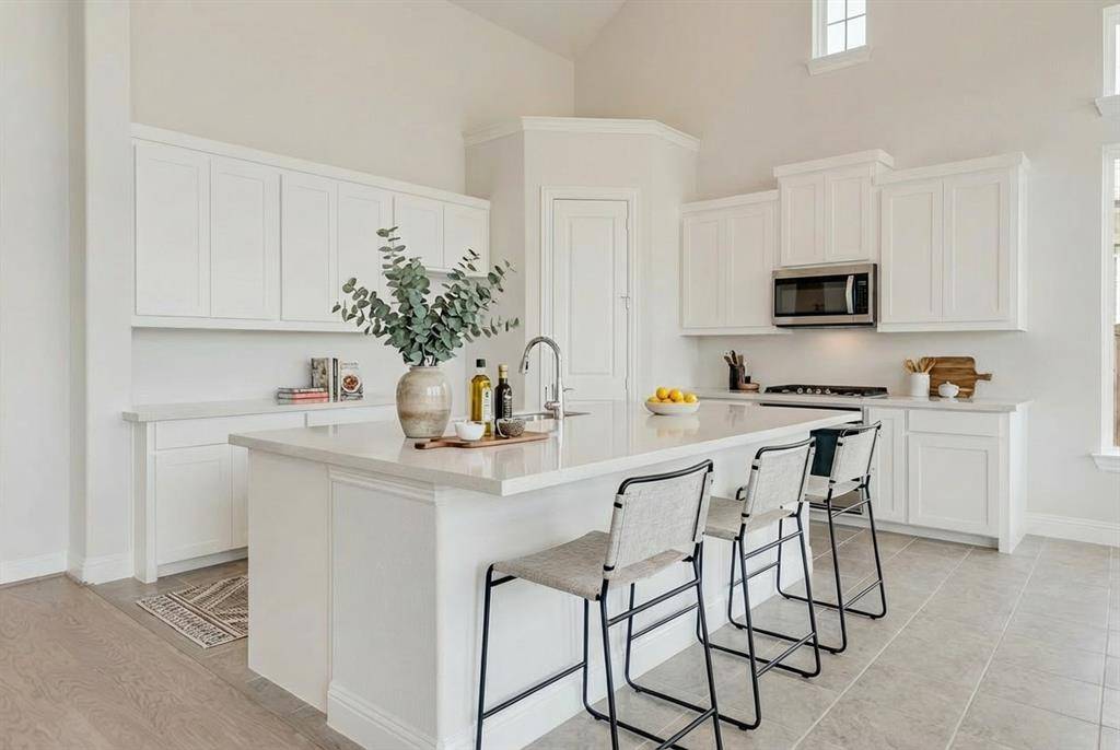 A private den offers flexibility for a home office, study, or quiet retreat. The chef-inspired kitchen pairs beauty and function with painted Shaker cabinetry, Omegastone slab countertops, stainless steel appliances including a gas cooktop, a full bowl sink, built-in spice storage, concealed trash drawer, and a spacious island designed for gathering.