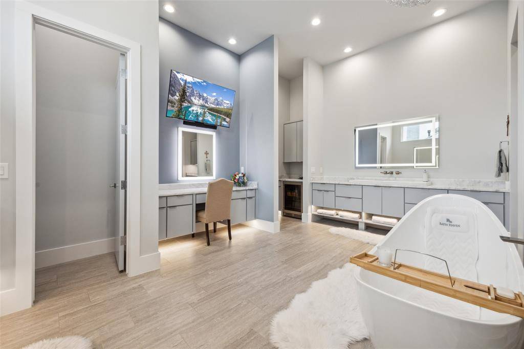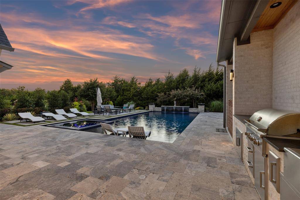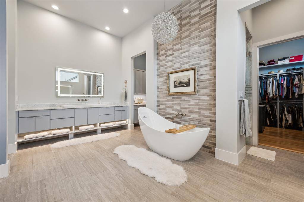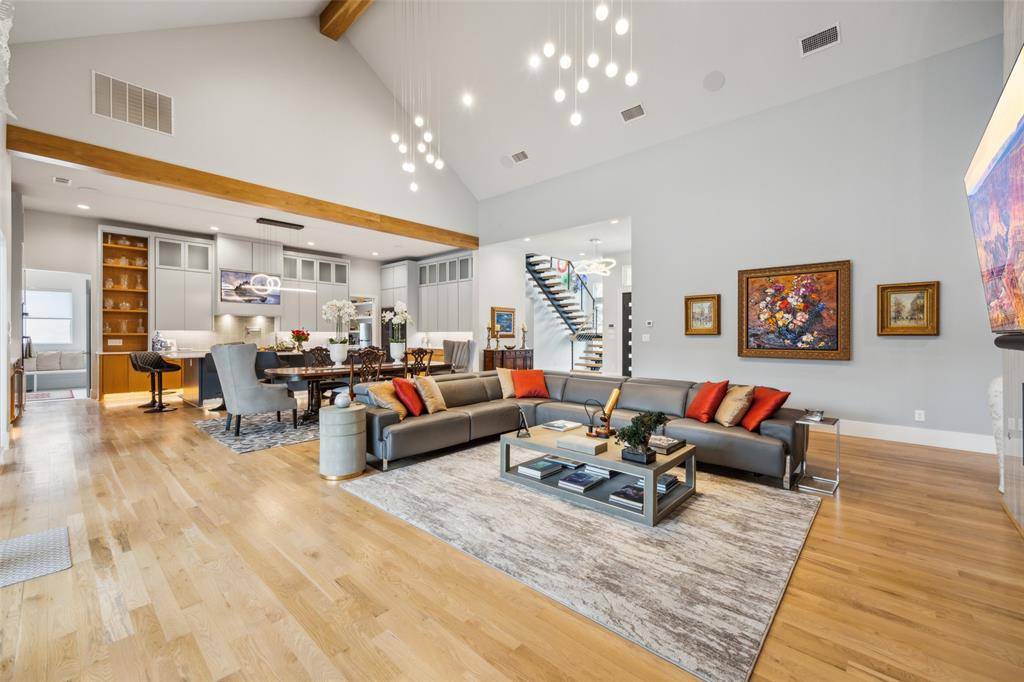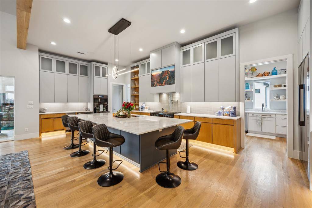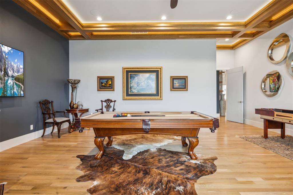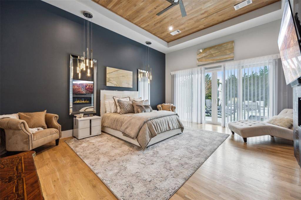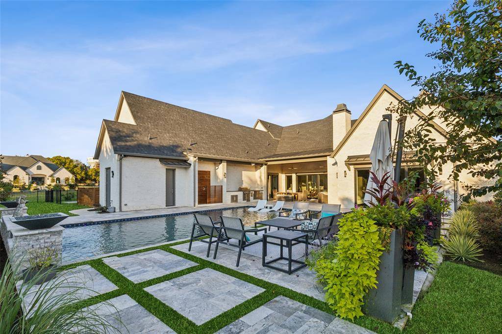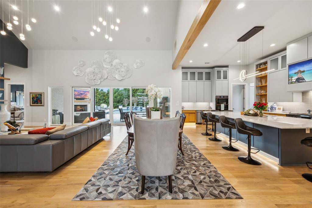 An extraordinary soft contemporary masterpiece by David Clark Custom Homes, this residence exemplifies impeccable design and craftsmanship. Grand smoked-glass double front doors open to soaring 12-ft ceilings and an awe-inspiring 25-ft ceiling in the main living area. Every detail is curated for luxury and function—from sound-reducing insulation throughout to custom electric window shades and floating bathroom vanities. A dramatic floating staircase with integrated step lighting leads to the upper-level living spaces, highlighted by sleek modern lighting. The expansive home office features coffered ceilings, creating a sophisticated workspace. The gourmet kitchen stuns with a massive 13-ft island that seats eight, Dacor appliances, dual dishwashers, a wine fridge, a built-in refrigerator, and elegant LED accent lighting. A dedicated dog wash adds convenience in the utility room. The serene primary suite boasts rich wood floors, a fireplace, and a custom walk-in closet with an island. Its spa-inspired ensuite includes dual rain heads, wall-mounted showers and a coffee bar with mini fridge. The living room overlooks a lush, tree-lined backyard with a spectacular 26'×40' resort-style pool, spa, fire bowls, and water feature. A travertine patio, outdoor fireplace, motorized blind, and integrated plant drip lines complete the oasis. The 3-car garage impresses with an enamel floor, Tesla charger, storage systems, and attic lift. Walk to top-rated schools. Some furnishings available for sale. Mortgage savings may be available for buyers of this listing.