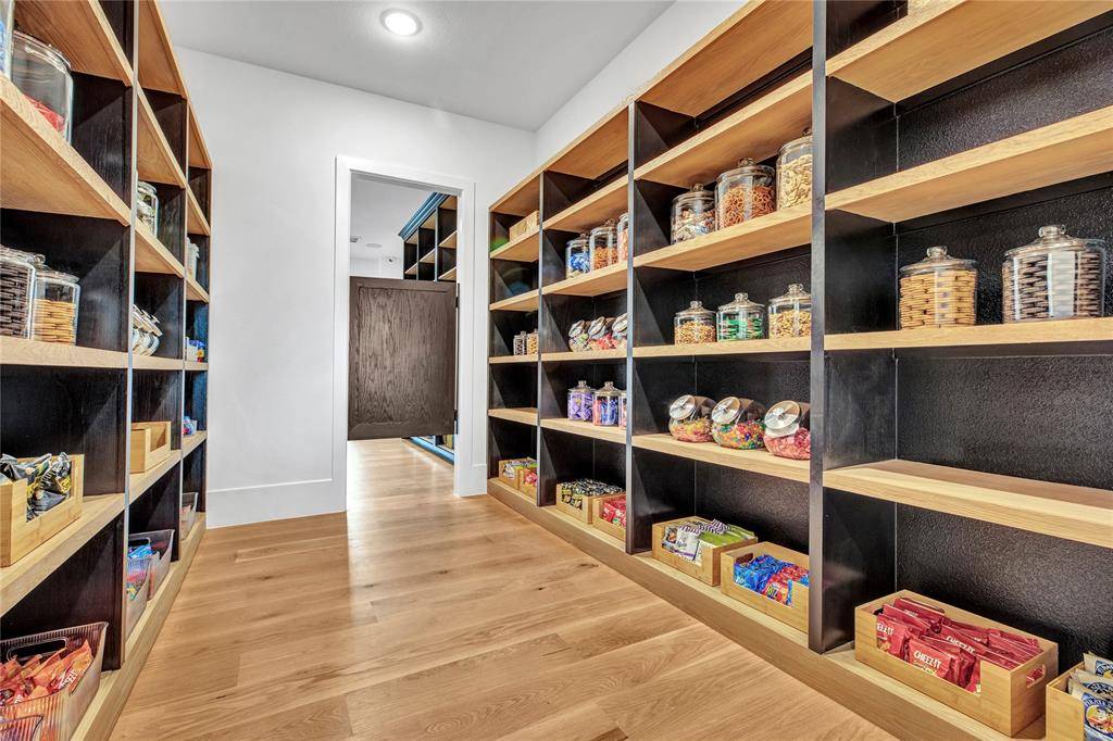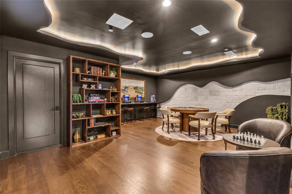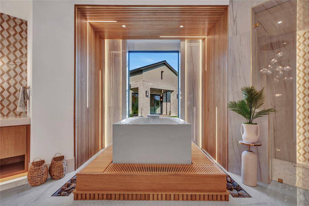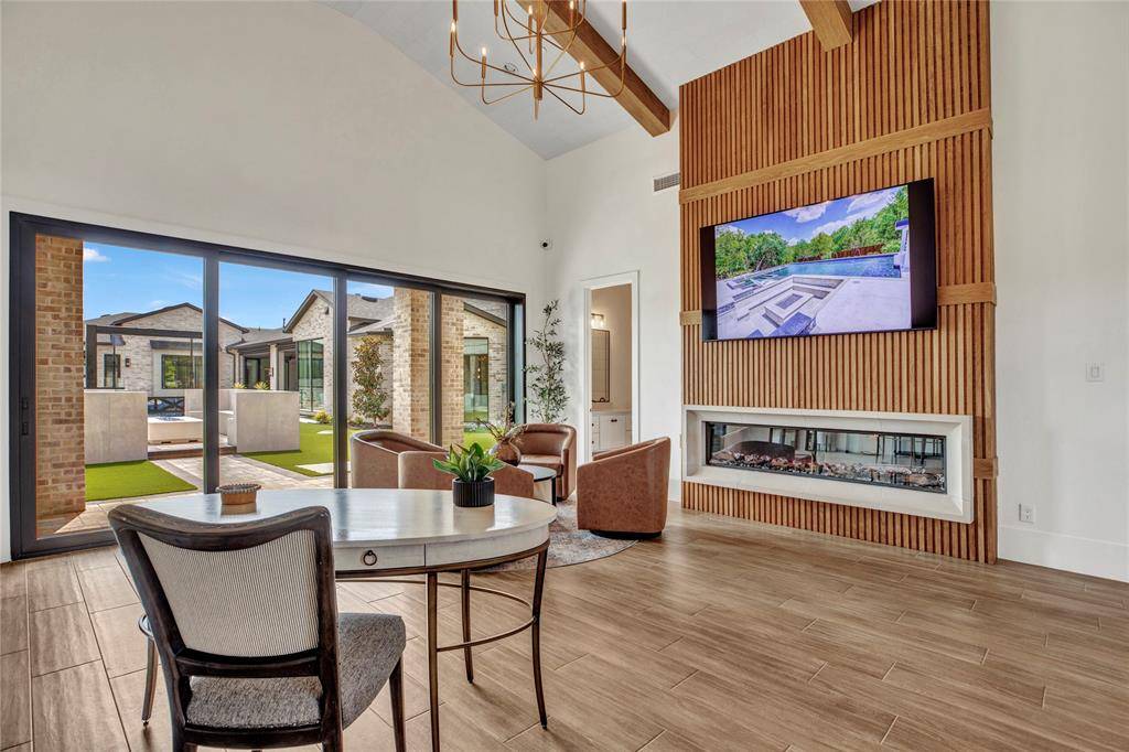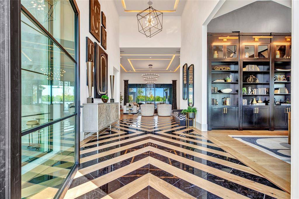 The open-concept kitchen is designed for both form and function, with premium appliances, an additional prep kitchen, and an extended walk-in pantry. Floor-to-ceiling windows in the main living area provide stunning views of the resort-style pool and outdoor entertaining space. The formal dining room features white oak flooring and a striking backlit wine wall, while a soaring 20-foot foyer with black-trimmed glass doors makes a bold first impression.