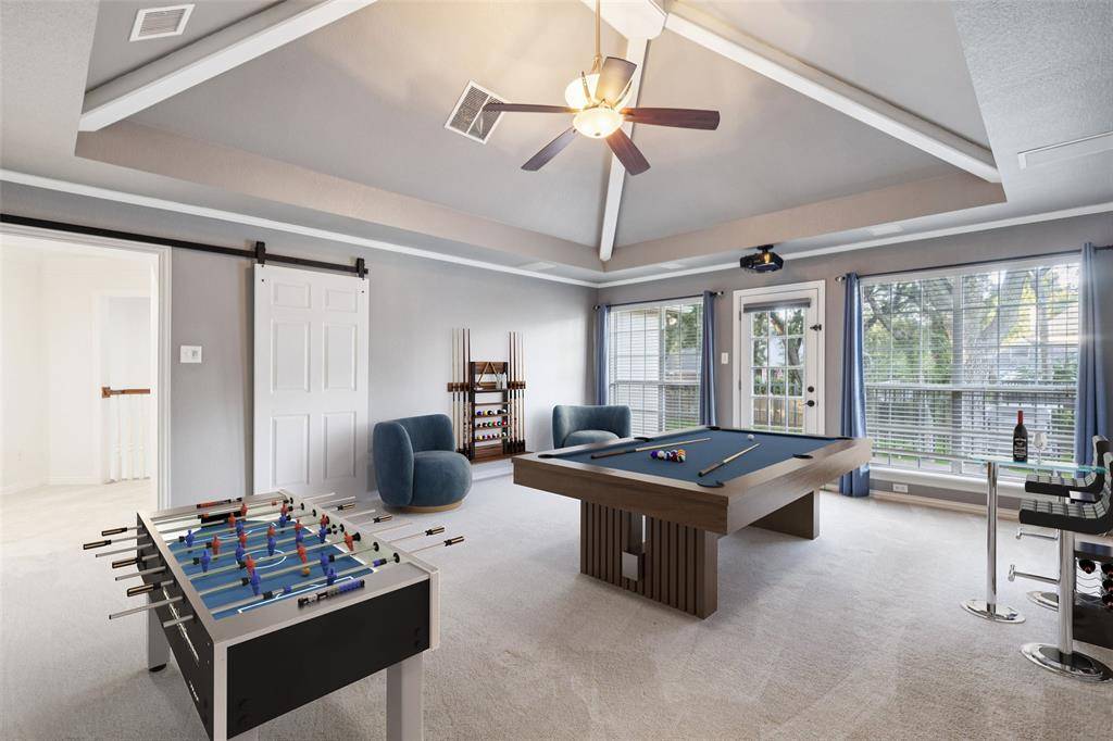Experience timeless elegance and refined comfort in this beautifully maintained residence nestled in the highly sought-after South Ridge Lakes community. Perfectly positioned on nearly half an acre, this exquisite 4-bedroom home offers the ultimate Southlake lifestyle within the award-winning Carroll ISD. From the moment you step through the grand entry with its soaring ceilings, you're greeted by a formal living room anchored by a warm fireplace and framed by three sets of double windows that flood the space with natural light. The heart of the home is the expansive open-concept family room, kitchen, and breakfast area, a seamless space designed for entertaining. The family room showcases a striking floor-to-ceiling stone fireplace, while the chef's kitchen impresses with dual islands, one ideal for prep, the other a wraparound bar perfect for gatherings. Enjoy top-tier stainless steel appliances, double ovens, an electric cooktop, and abundant cabinetry for effortless culinary experiences. Retreat to the luxurious primary suite, featuring a serene sitting area with bay windows and a spa-inspired ensuite bath with dual vanities, a jetted soaking tub, separate shower, and a massive walk-in closet. A secondary downstairs bedroom provides flexibility for guests or multigenerational living. Upstairs, the spacious game room with a built-in wet bar and a private balcony overlooking the backyard sets the stage for entertaining, while two additional bedrooms offer comfort and privacy for family or guests. Step outside to your personal oasis, an expansive backyard featuring a sparkling fenced pool, lush landscaping, mature trees, and a full outdoor living center complete with a built-in grill. Whether hosting summer soirées or enjoying quiet evenings poolside, this outdoor retreat is designed for relaxation and connection.