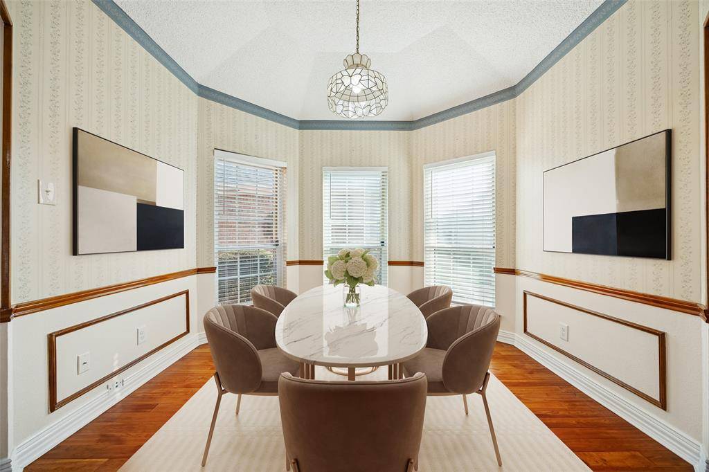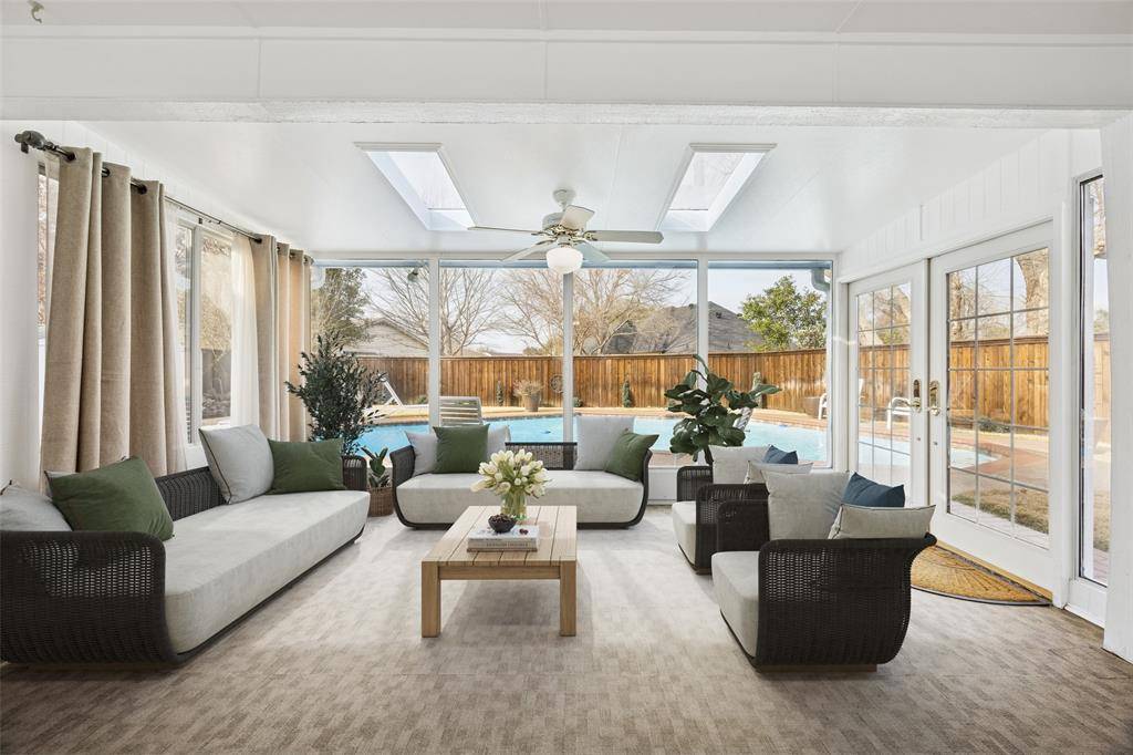Welcome home to this move-in ready gem in the heart of Trophy Club Village! This beautifully cared-for 3-bedroom, 2-bath home offers a warm, inviting feel from the moment you walk through the door, with rich wood floors & a spacious living room anchored by a charming brick fireplace and eye-catching coffered ceilings. Kitchen is thoughtfully designed for both everyday living & effortless entertaining, featuring an island, abundant cabinetry, granite + SS apps. You'll appreciate the versatility of a formal dining room with beautiful bay windows, along with a sunny breakfast nook that's ideal for relaxed mornings and coffee-filled starts to the day. One of the standout spaces is the incredible sunroom, filled with natural light from a wall of windows overlooking the backyard and sparkling pool. Whether you envision a playroom, game room, or second living area, this versatile space offers direct access to the backyard. The primary suite is a peaceful retreat, complete with vaulted ceilings and a beautifully updated ensuite bath featuring dual sinks, a separate shower, and a stunning freestanding soaking tub. Two additional bedrooms provide comfortable space for kids, guests, or a home office. A large utility room with extra storage keeps everything organized and out of sight. Step outside and discover your own private backyard oasis. The expansive pool with diving board and generous patio space sets the stage for unforgettable summer afternoons and weekend barbecues. Two storage sheds offer plenty of room for tools and outdoor gear. The garage, finished with interlocking tile flooring, adds a polished and practical space for projects, hobbies, or extra storage. Zoned to the award-winning Northwest ISD, this home delivers the perfect balance of small-town charm and big-city access. With Trophy Club's golf cart-friendly streets and strong sense of community, this is more than just a house, it's a place to grow, gather, and create lasting memories.