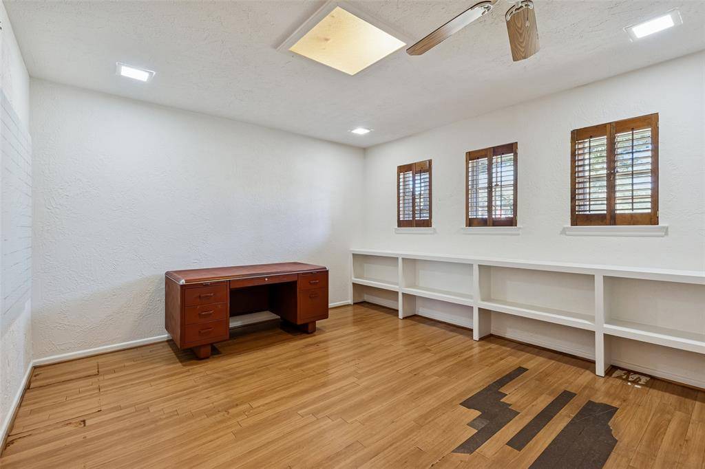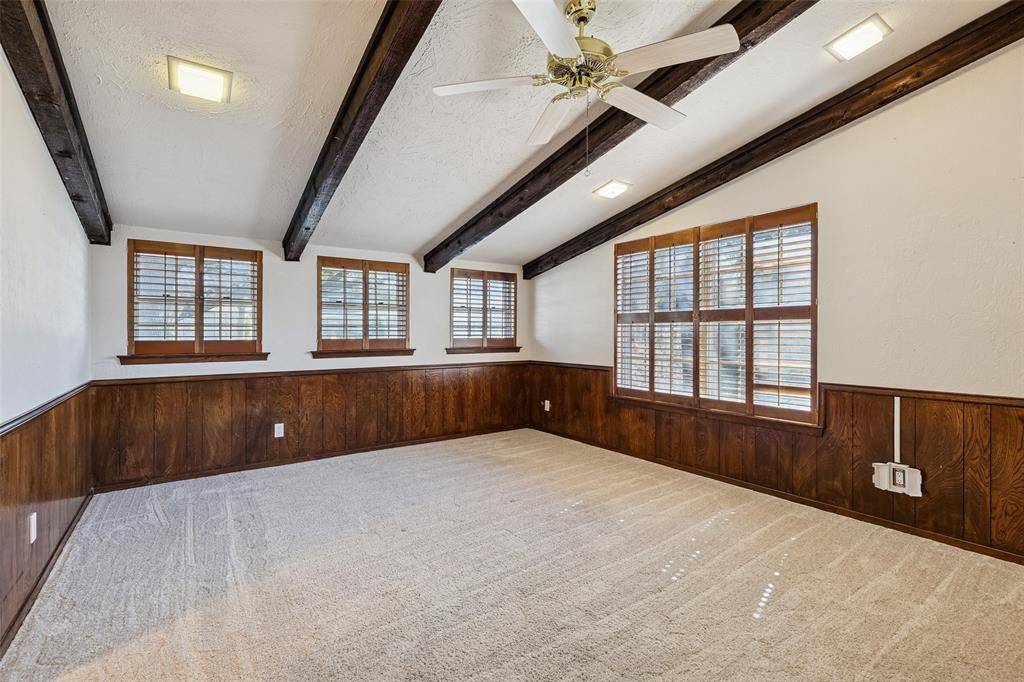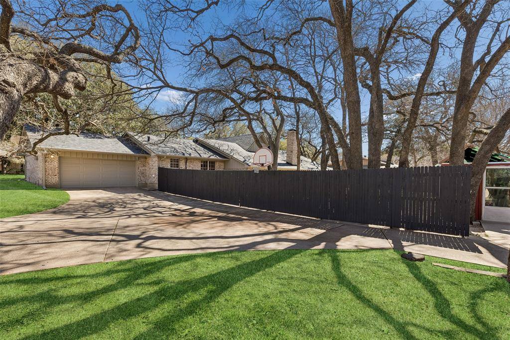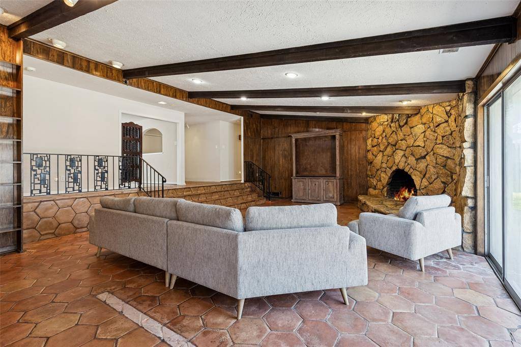 Situated on over half an acre in the established Live Oak Estates of Irving's Historic Hospital District, this sprawling one-story mid-century estate offers incredible bones, an exceptional floor plan, and timeless architectural character that's hard to find. Towering grandfather live oaks frame the expansive corner lot, creating a sense of presence and privacy from the moment you arrive. Inside, a wide entry welcomes you into a dramatic sunken living room featuring a floor-to-ceiling stone fireplace, rich wood-paneled walls, exposed beamed ceilings, Saltillo tile flooring, and a classic wet bar. The formal dining room is generously sized and enhanced with custom built-ins and large windows that bring in beautiful natural light. The kitchen sits at the heart of the home and offers dual ovens, a center island, abundant cabinetry, and extensive counter space. A full-size utility room with built-ins and sink adds convenience and functionality. Formal Dining offers exceptional flexibility and could easily serve as a study. The thoughtfully designed layout offers ideal bedroom separation, including a spacious primary suite with beamed ceilings plus dual en-suite baths with all the extras! Step outside to a massive backyard shaded by mature oak and elm trees, backing to the Delaware Creek canal and offering an abundance of green space. The open patio provides the perfect setting for outdoor entertaining, and the rear-entry two-car garage maintains the home's classic curb appeal. Ideally located just minutes from DFW Airport, Love Field, Las Colinas, Downtown Dallas, and major highways, this property combines space, character, and convenience in one of Irving's most established neighborhoods. A rare opportunity to own a sprawling single-story estate with exceptional bones and a fantastic floor plan in a prime location.
