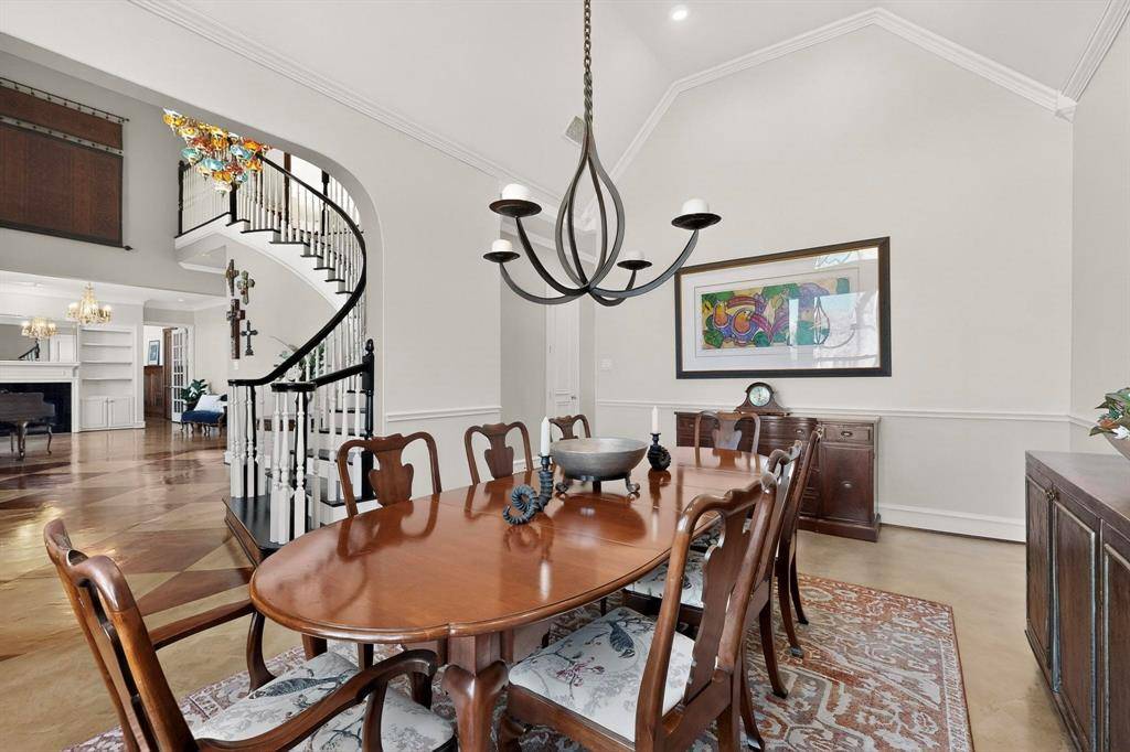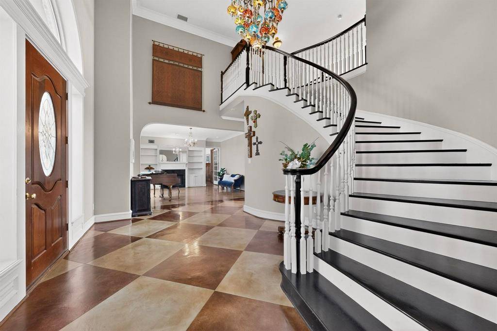 Step inside to a grand entryway featuring a dramatic curved staircase, soaring ceilings, and exquisite multi-tiered crown moldings. FLOOR TO CEILING WINDOWS flood the home with natural light while showcasing breathtaking golf course views.