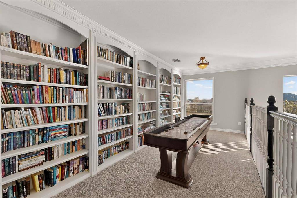 A stunning built-in library with custom shelving and a balcony overlook providing sweeping views of the den below and the beautiful Buffalo Creek Golf Club golf course beyond. Welcome Book lovers!