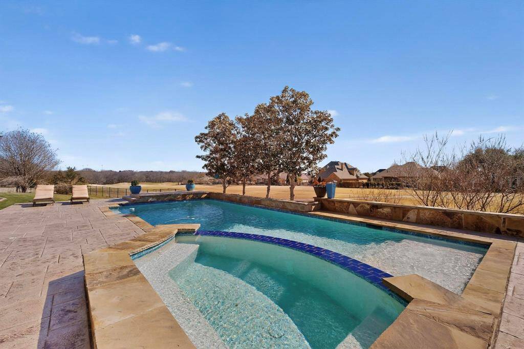 The spacious open floor plan includes 2 fireplaces and expansive living areas with custom built-ins. The chef's kitchen and dining area overlook the back yard and covered patio. Enjoy a modern sparkling swimming pool, relaxing hot tub, and large, fully fenced backyard — all perfectly positioned along the golf course, with views you can dream of.