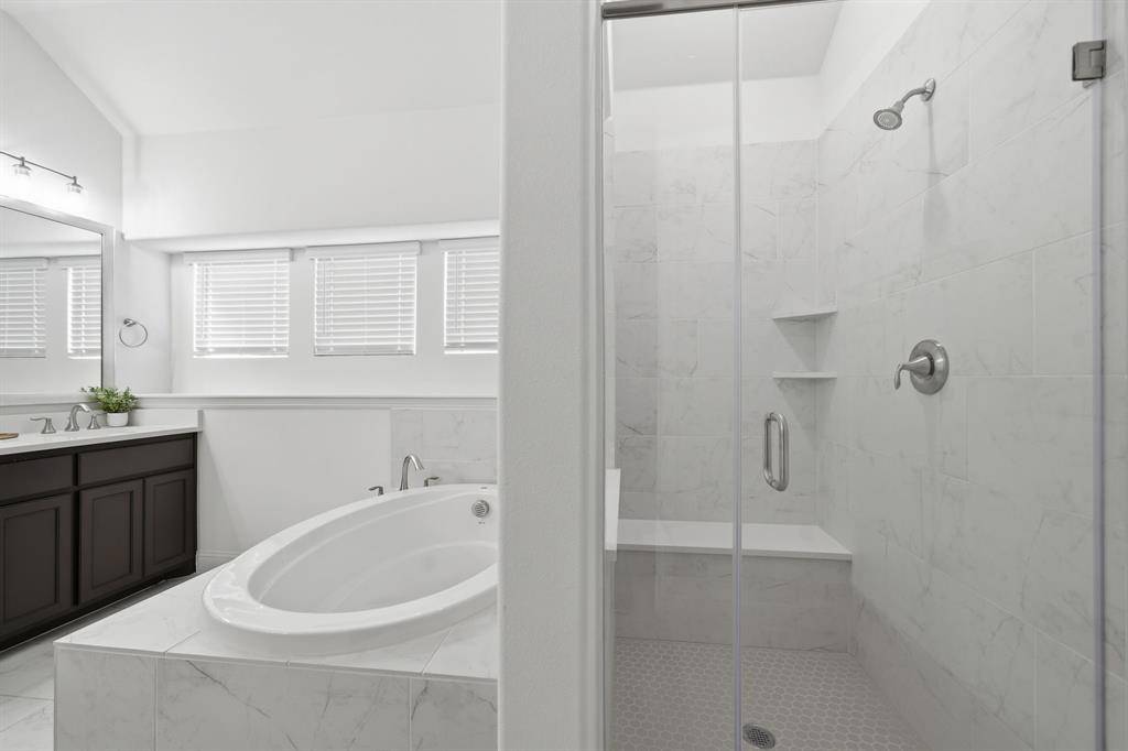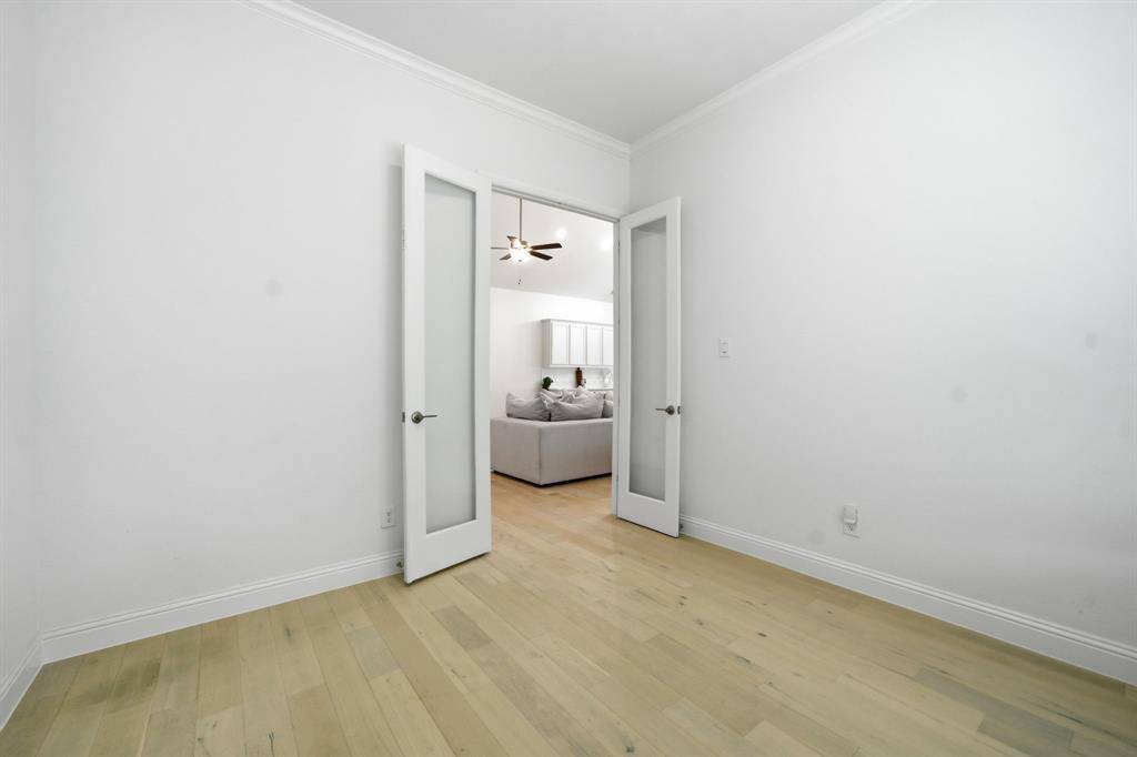 A private study with glass doors is perfectly situated off the main living area, ideal for working from home. The secluded primary retreat offers a peaceful escape with a soaking tub, separate shower, and an oversized walk-in closet.