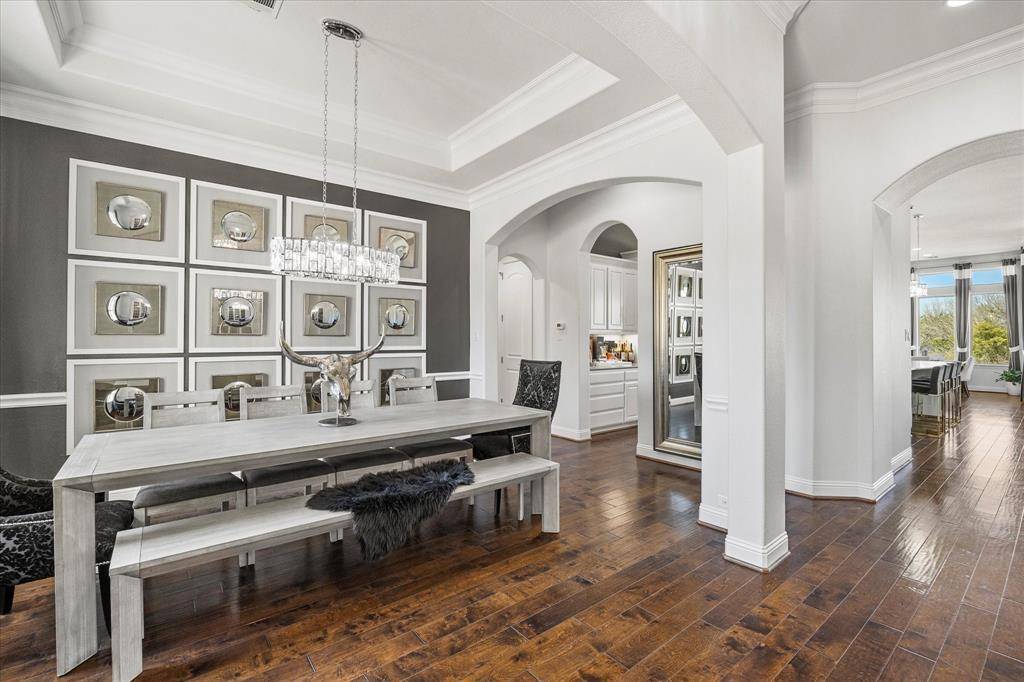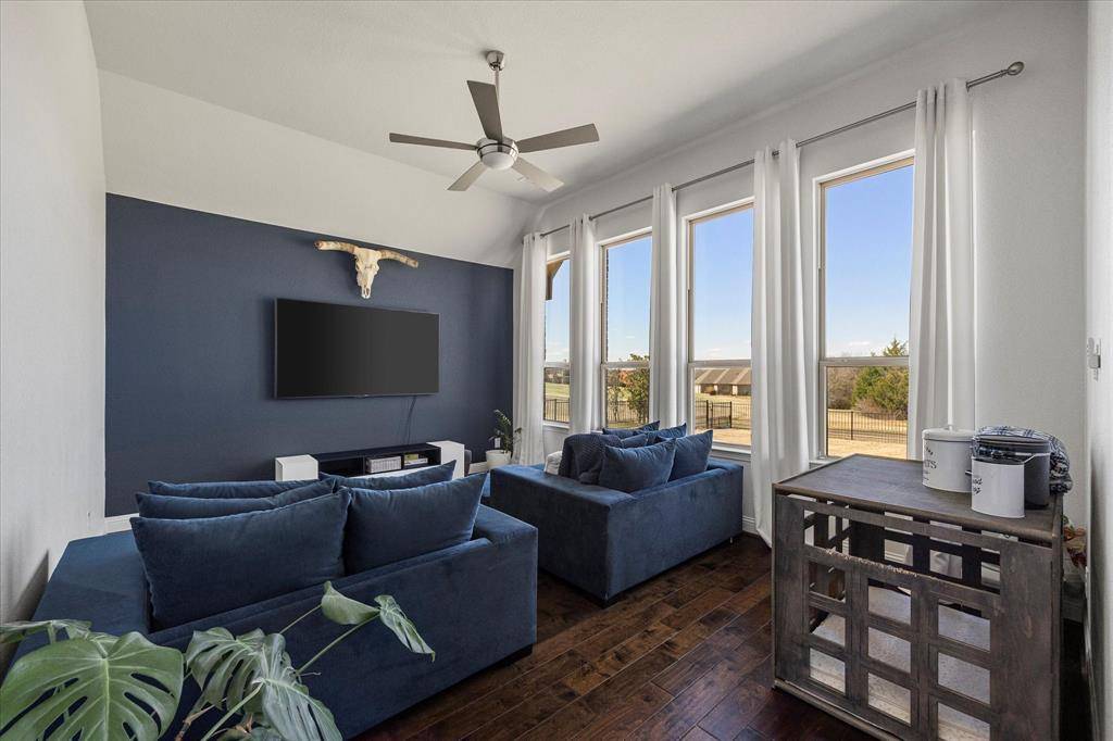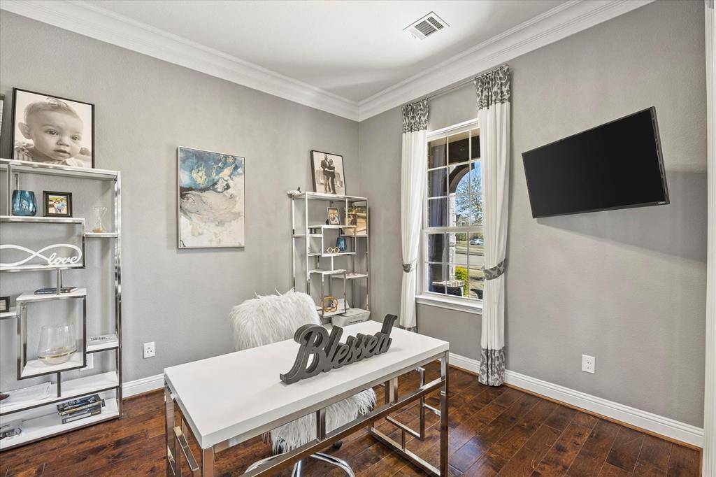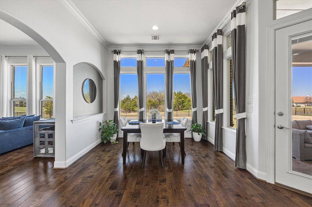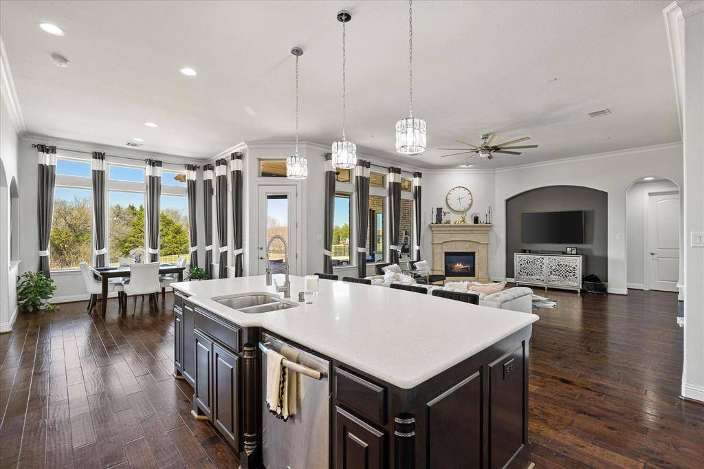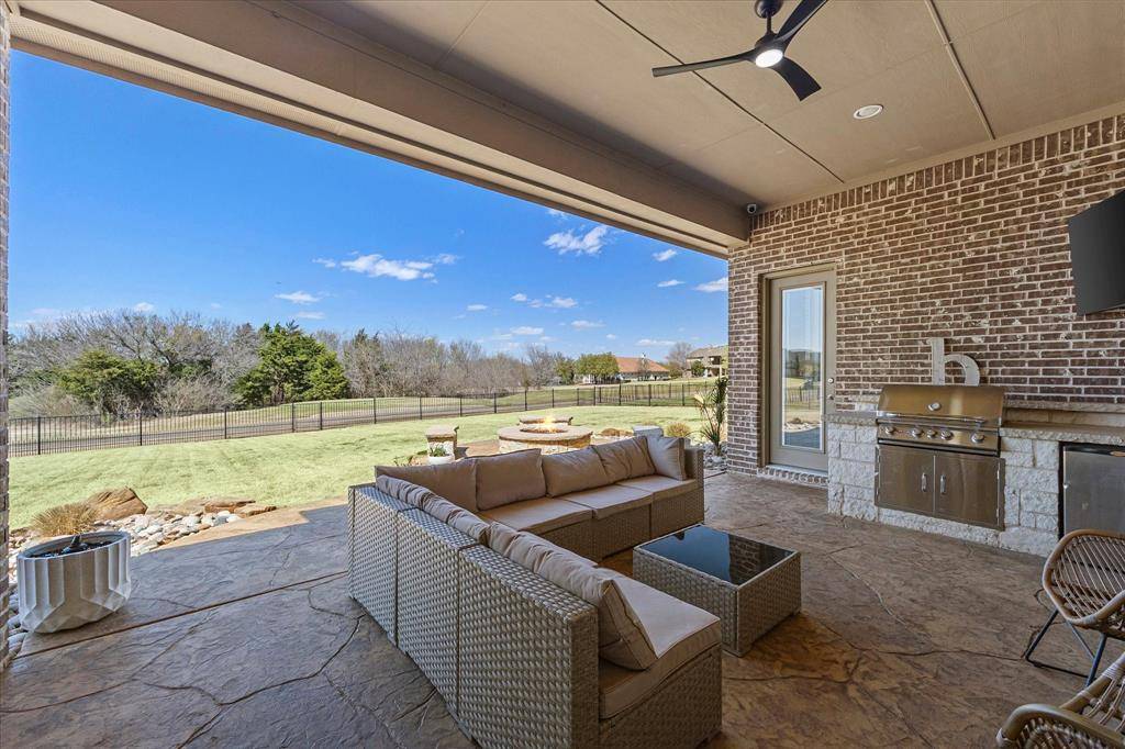 This stunning estate, sits on the 4th tee box of the Buffalo Creek Golf Course! Situated on almost a half acre, this beautiful contemporary home features immaculate landscape and an open and airy one-story floor plan. Upon entry, you will find gorgeous hardwood flooring, a dedicated private office, and an open formal dining room. The living room seamlessly blends in with the kitchen, offering the perfect balance of comfort and style. The modern gourmet kitchen has been updated to include quartz countertops, stainless appliances, a huge island, and a butler's pantry. There is a well-appointed media room-2nd living area, located just off the kitchen, perfect for relaxing or entertaining guests. The primary suite is tucked away for privacy and features double vanities, a frameless tiled shower and a walk-in closet. There is guest suite that boasts a private, full-bathroom, perfect for hosting guests. The two oversized secondary bedrooms offer large closets and share a gorgeous updated bathroom. Step out back, to enjoy the expansive views from the covered patio with a built-in grill, outdoor kitchen, and sitting area. Or, unwind around the fire pit with friends and family, where you can take in the serene surroundings and watch the golfers pass by. The spacious three car garage and extended driveway offers plenty of parking options. With its prime location, updated interior, and golf course views, this home is truly a rare find. Don't miss your chance to make this one yours!