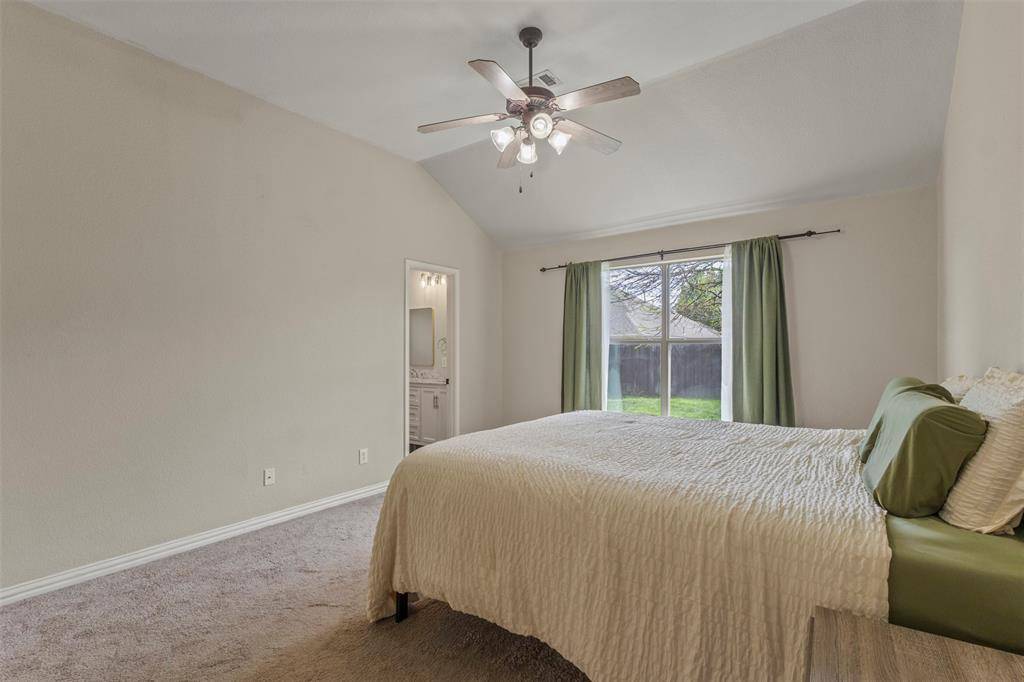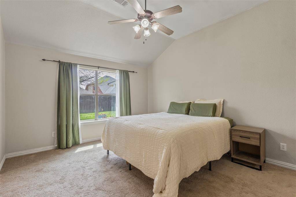 Additional highlights include a dedicated laundry room with a stacked washer and dryer (You can do side by side) and a folding counter! Out back is a covered back patio with a ceiling fan and ambience lighting, perfect for a relaxing Texas evening! It also features a fenced backyard with mature trees and charming garden beds! This backyard is perfect for kids or those who enjoy gardening!