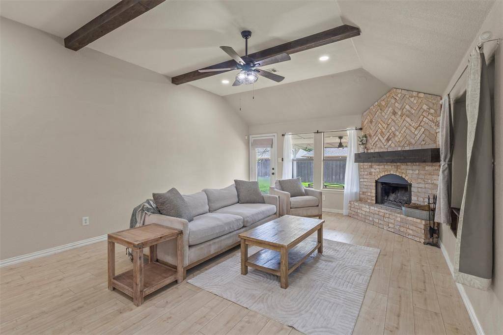 Step inside to a show-stopping great room featuring dark wood beam accents, rich hardwood-style laminate flooring, and a striking floor-to-ceiling herringbone brick fireplace that serves as the heart of the home! The open-concept layout flows seamlessly into the kitchen and dining area, making it perfect for entertaining!