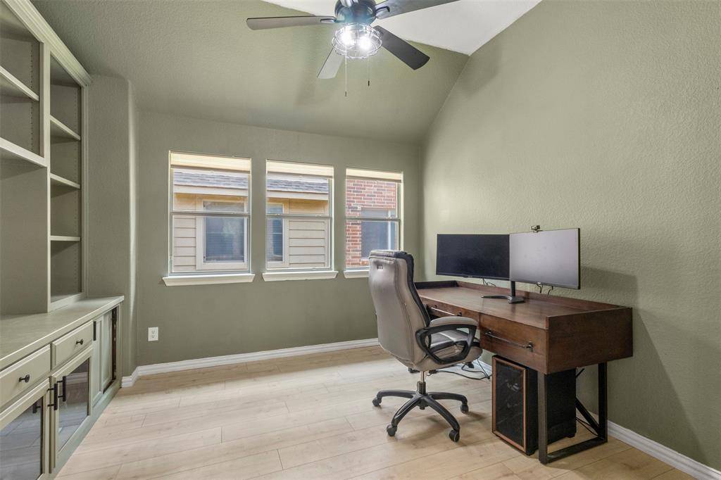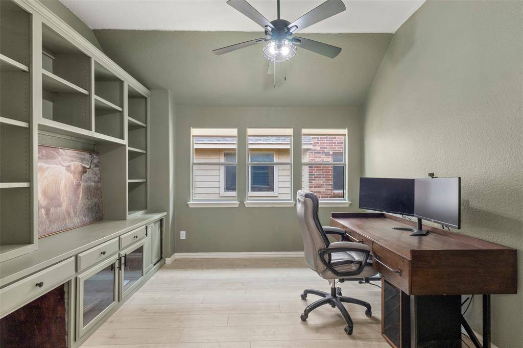 The primary suite offers a peaceful space and en suite bath featuring a dual-sink granite vanity, soaking tub, and separate shower! Two additional spacious bedrooms provide flexibility, and a LARGE, stylish home office complete with built-in shelving and cabinetry! Ideal for remote work or a playroom! A well-appointed secondary bath serves guests and family with ease.