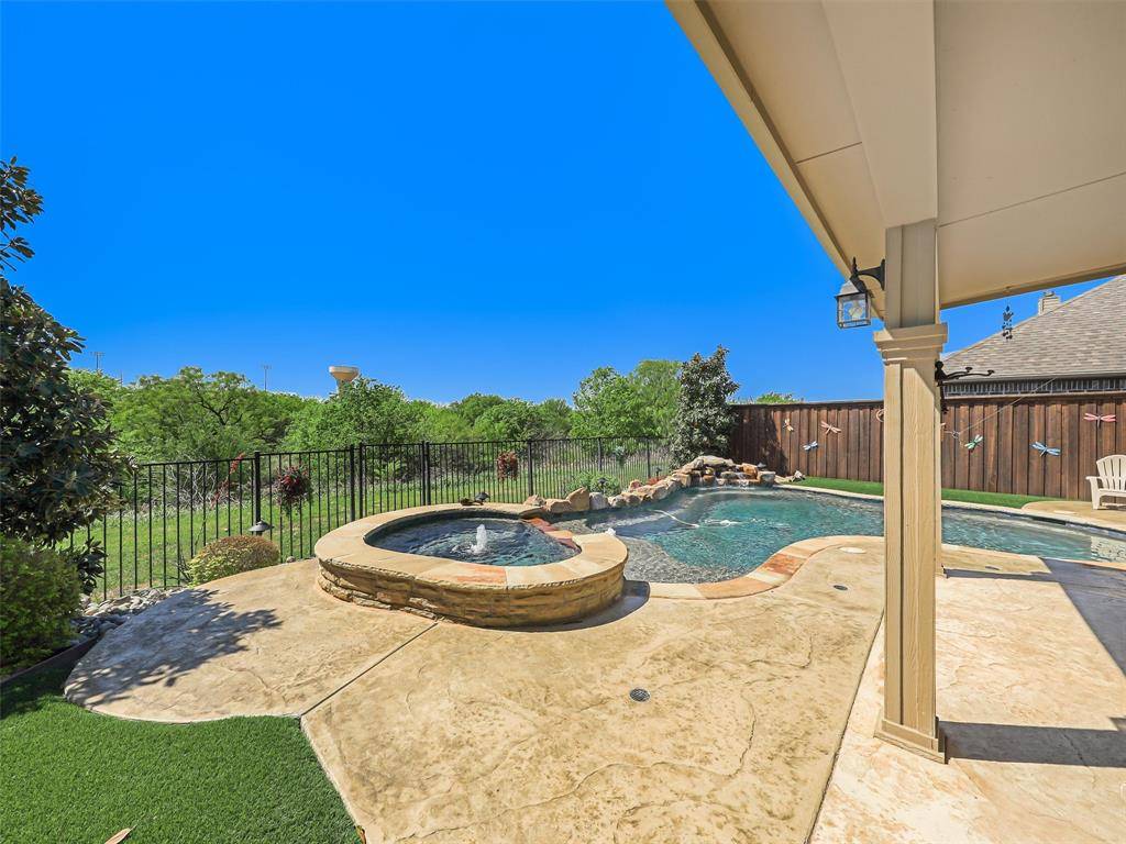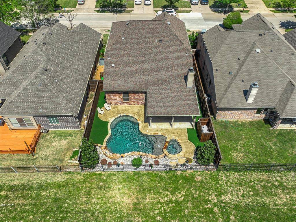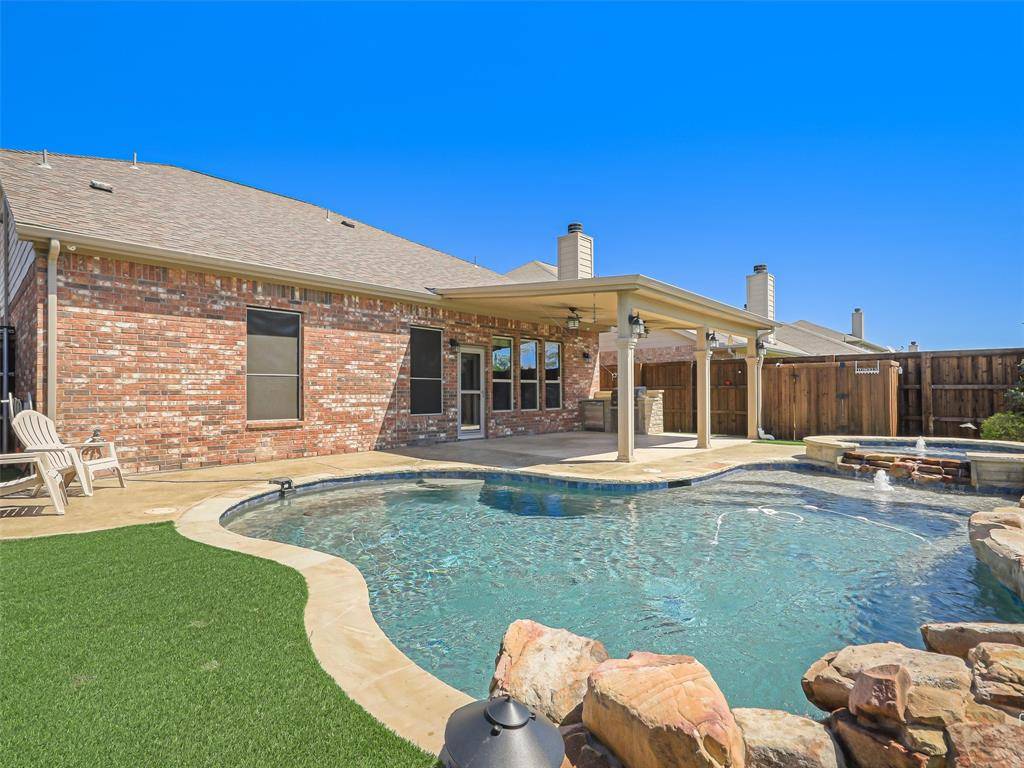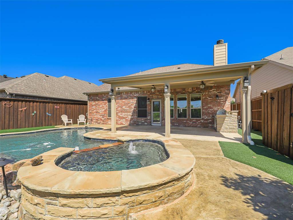 Beautiful Pool Home Backing to Greenspace and Creek- Welcome to 16416 Toledo Bend Court—where comfort, style, and outdoor living come together in one exceptional home. Ideally located and zoned to highly sought-after Prosper ISD, this home offers both convenience and top-tier schools. Situated on a private greenbelt lot, the property creates a true backyard oasis designed for relaxation and entertaining. Step outside to enjoy the stunning propane-heated pool and spa built by Riverbend Sandler, complete with water features, two waterfalls, tanning ledge, and an extensive seating ledge. The outdoor space continues with a covered patio featuring a built-in grill and refrigerator, low-maintenance turf, and a 7-foot board-on-board fence along the sides with an iron fence along the greenbelt—perfect for privacy and year-round enjoyment. Inside, the home showcases thoughtful updates and quality finishes throughout. Fresh interior paint, including cabinets, enhances the bright and inviting feel, while newly installed luxury vinyl plank flooring in the dining room, primary bedroom, and family room adds modern appeal. The living room overlooks the backyard and features a cozy wood-burning fireplace. The primary suite offers a relaxing retreat, with an en-suite bath featuring quartz countertops, a framed mirror, jetted tub, separate shower, and walk-in closet. Upstairs, enjoy a spacious game room ideal for entertaining or flexible living. In addition, you will find three nicely sized bedrooms and a second bathroom updated with quartz counters and painted cabinetry. Additional highlights include a walk-out attic for easy storage, a two-car garage with extra workshop space, extensive crown molding, a Lennox HVAC system installed in 2024, and a Class 4 impact-resistant roof shingles. This home combines thoughtful upgrades, functional living spaces, an excellent location, and an unbeatable outdoor setting—don't miss your opportunity to make it yours! Tons of Community Amenities