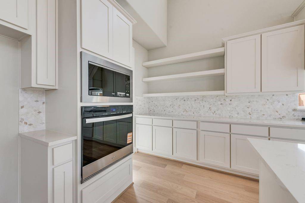 The stunning kitchen features Omegastone slab countertops, Shaker cabinetry, stainless steel appliances, a 5-burner gas cooktop, a large island with pendant lighting, a huge walk-in pantry, and floating shelves. The covered back patio provides the perfect setting for outdoor entertaining.