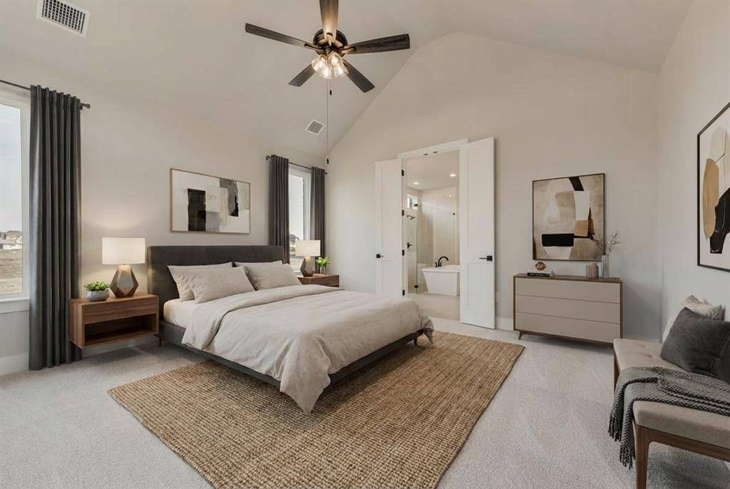 The private primary suite offers cathedral ceilings, a sitting area, and a spa-inspired bath complete with a freestanding garden tub, separate vanities, frameless glass tiled shower with double heads, and his & her walk-in closets. There is a downstairs guest suite, while three additional bedrooms are located upstairs. Energy Star features include R38 insulation, and double-insulated vinyl windows for energy efficiency.