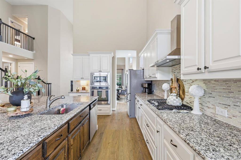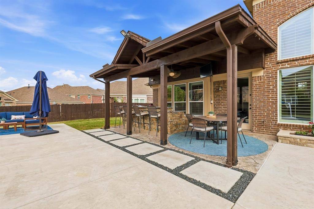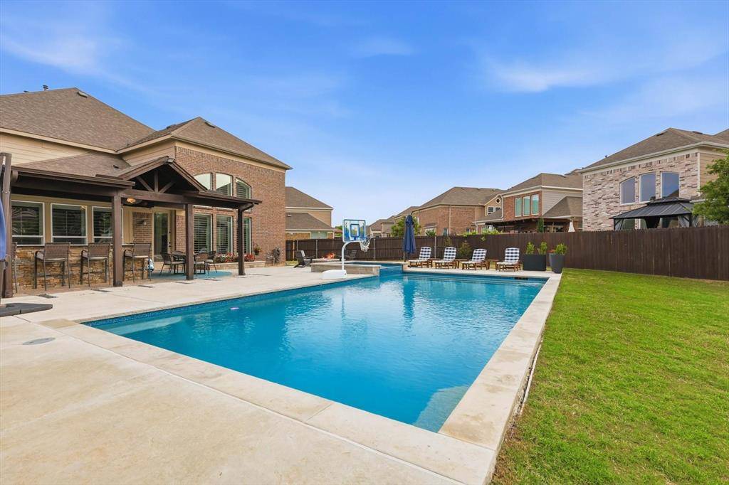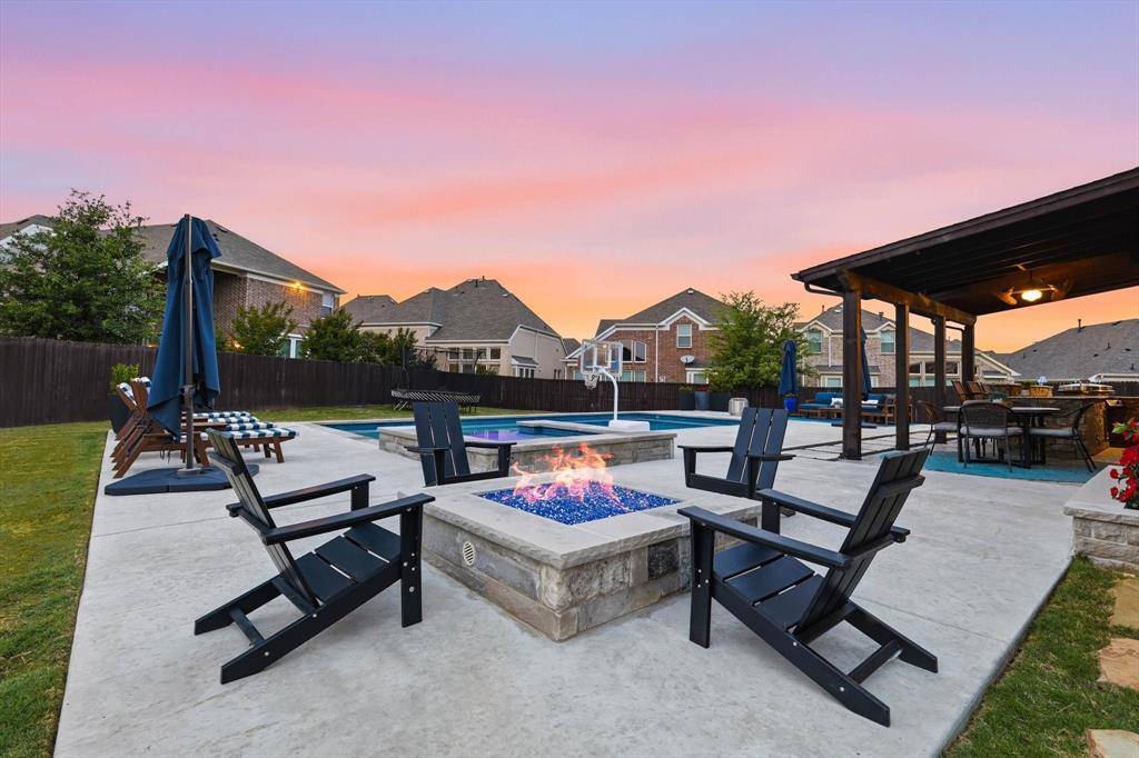 Nestled on an oversized cul de sac lot in a quiet, established neighborhood, this home offers a rare combination of privacy, space, and resort style outdoor living. The uniquely shaped lot is one of the largest in the community, creating an expansive backyard retreat designed for both entertaining and everyday enjoyment. The outdoor living space features a heated in ground pool with attached spa, recently updated equipment, and multiple areas to relax or gather. A covered patio with built in outdoor kitchen with ample bar seating allows for year round entertaining, while the firepit and open yard space create the perfect setting for evenings under the stars and weekend smore gatherings.