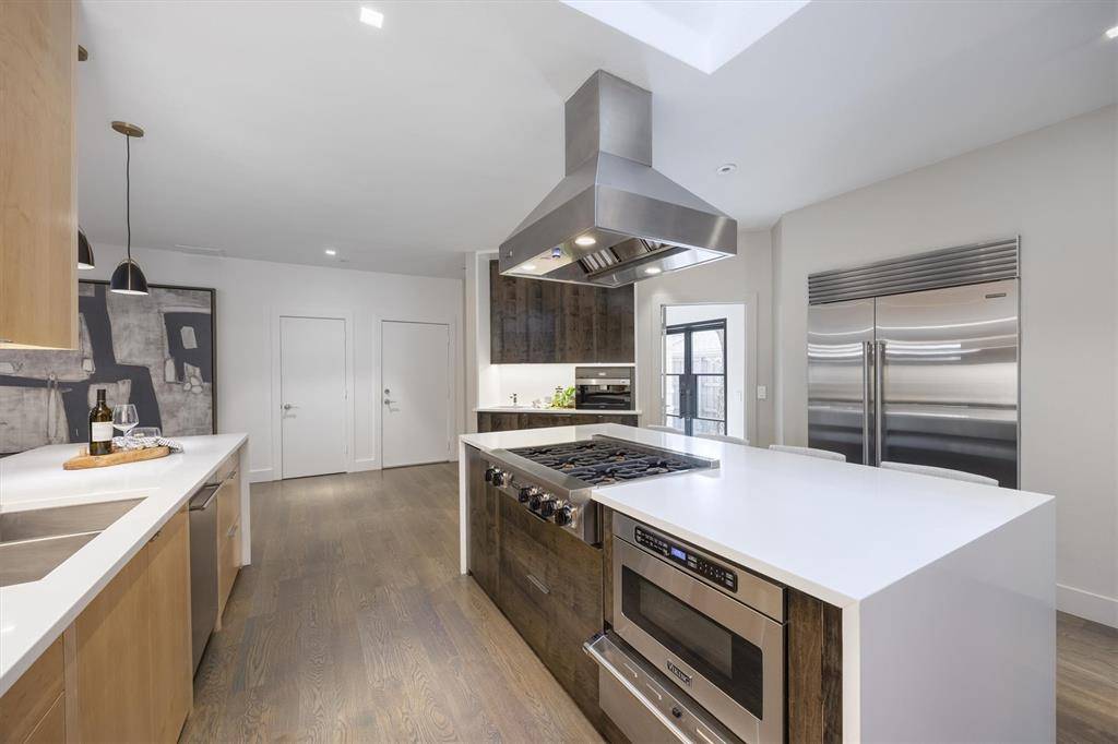 The sleek, contemporary kitchen features premium Viking appliances, a Sub-Zero refrigerator, a walk-in pantry, and a dedicated coffee station with a Miele built-in system- perfect for slow mornings or hosting with ease.