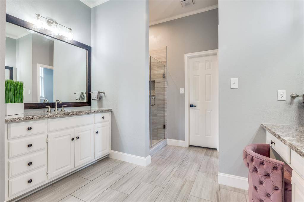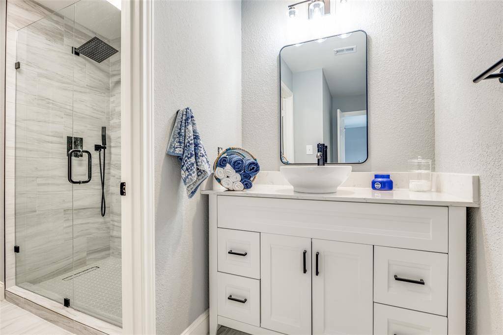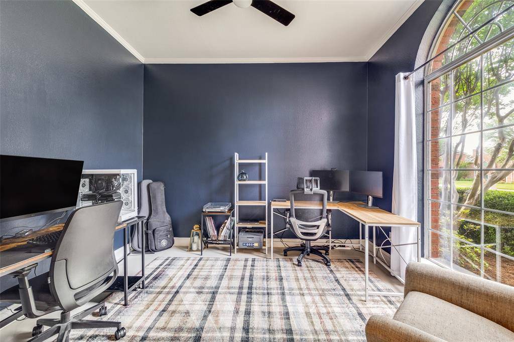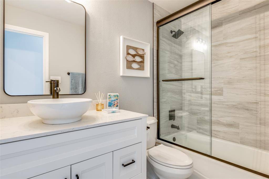 NEW PRICE on this beautifully renovated Plano gem..stylish, welcoming, and truly move-in ready. If you've been searching for a home that feels as good as it looks, this may be the one. Filled with natural light and thoughtfully updated throughout, it offers the perfect balance of modern design, everyday comfort, and a location in one of Plano's most desirable neighborhoods. From the moment you step inside, you'll notice the fresh, bright interior with designer white and gray tones, sleek finishes, and an open, inviting layout. The kitchen is the heart of the home, perfectly designed for real life and easy entertaining—with a large island, updated appliances, and generous cabinet storage. Whether you're hosting friends, helping with homework, or enjoying a quiet morning coffee, this space makes every day feel effortless. The spacious primary suite is a true retreat, featuring a spa-inspired bath with separate vanities, a soaking tub, frameless glass shower, and stylish modern fixtures. Also downstairs, you'll find a private study ideal for working from home, plus a guest bedroom and full bath perfect for visitors or multi-generational living.Upstairs offers two additional bedrooms connected by a beautifully renovated Jack-and-Jill bath with a walk-in shower, along with a flexible bonus space featuring floor-to-ceiling built-ins, ready to become a library, playroom, homework zone, or organized storage area.