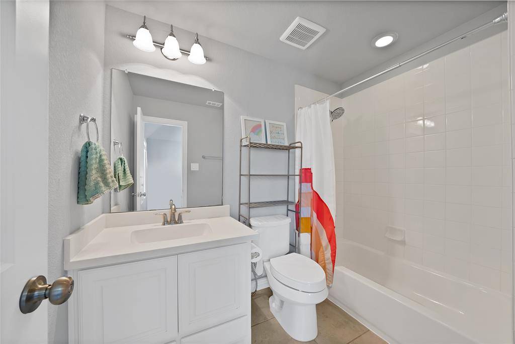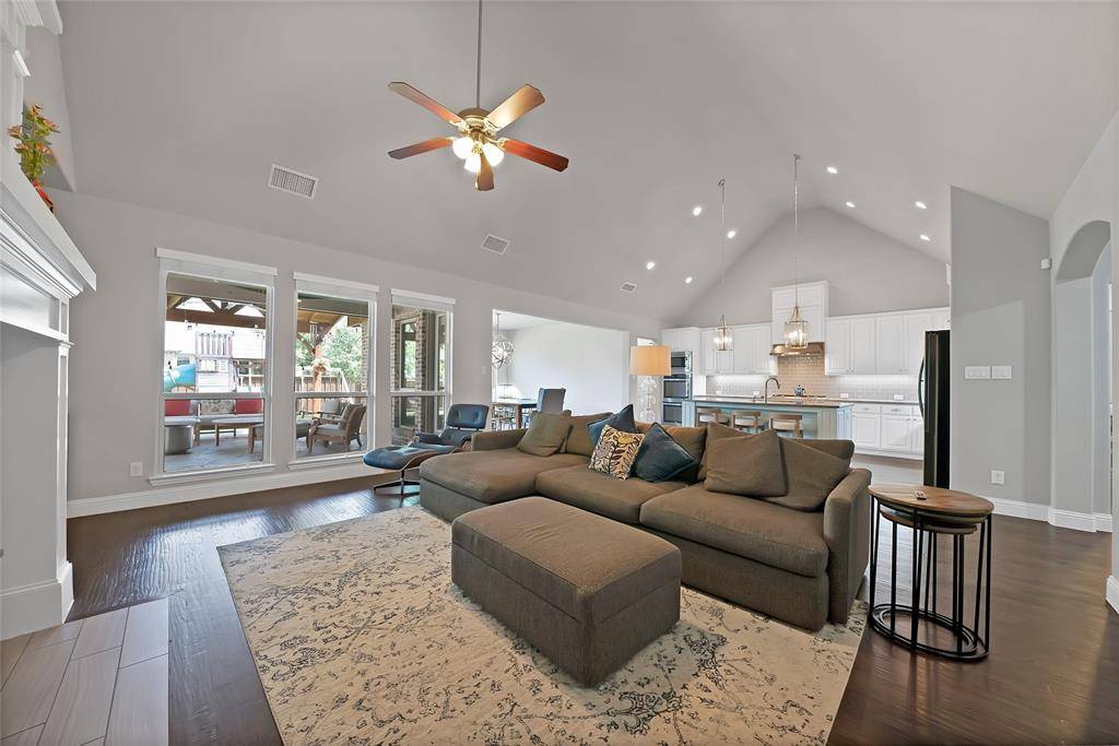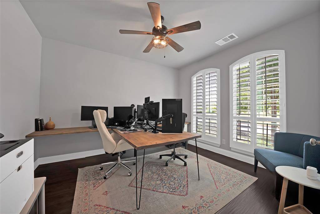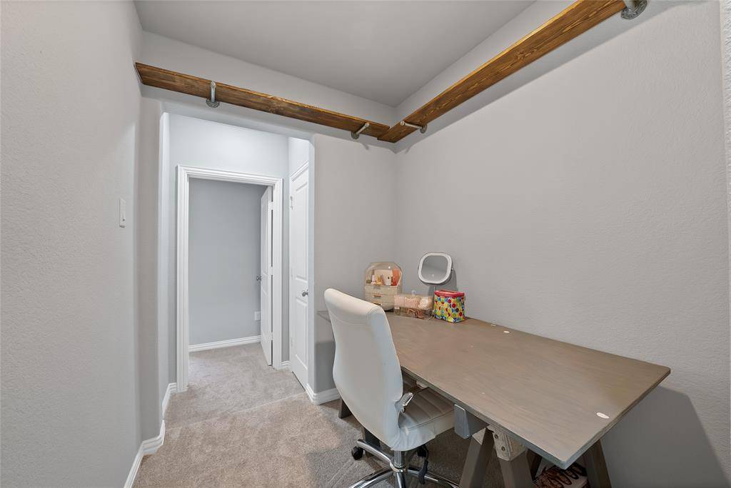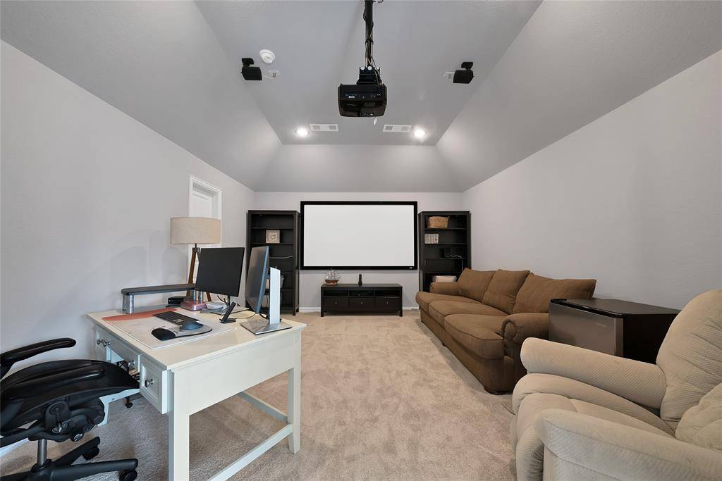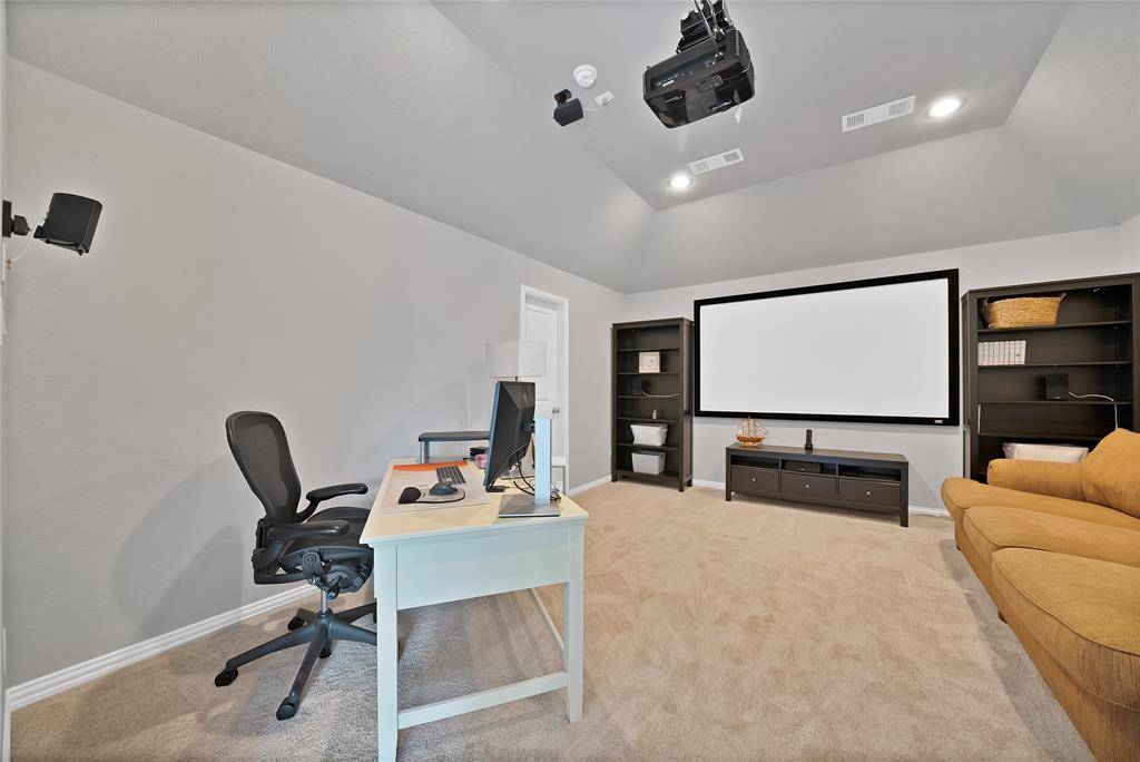 This stunning 4 bdrm, 3.1 bath residence in Prosper ISD epitomizes modern luxury & comfort, all nestled on an oversized lot with a rare greenbelt view. Designed with both style & functionality, this home offers an inviting open floor plan, perfect for entertaining & everyday living. Thoughtfully designed as a 1.5 story layout, the home features a private upstairs retreat complete with a secondary bedroom & full bath, along with a spacious game room & dedicated media room, ideal for guests & family fun alike. Step inside to find extensive hand scraped wood floors that seamlessly connect the spaces, enhanced by vaulted ceilings, fresh interior paint & recent carpeting. The grand entryway boasts a convenient built-in bench & organization station. The home office features a dual workstation, ideal for productivity. The gourmet kitchen boasts extensive cabinetry, stainless steel appliances, attractive granite counter tops, undercabinet lighting & a large walk-in party. Flowing effortlessly into the dining & main living areas, this area is ideal for both intimate dinners & lively gatherings. The primary suite is a private retreat, featuring a luxurious bath with a relaxing, deep-soaking garden tub, shower & a generous walk-in closet. Additional bedrooms are well-sized, providing flexible options for everyone. Enjoy endless entertainment for all with a spacious game room & adjoining media room. Storage is plentiful throughout, ensuring everything from seasonal decor to daily essentials has its place. Embrace the outdoors in your expansive backyard with an electronic gate at the driveway, extending your play & entertainment area. The extended outdoor living space, complete with a built-in grill, transforms your backyard into a private outdoor retreat. Practicality meets luxury with a highly versatile 3-car tandem garage with extra storage. This home is a rare find, offering a blend of unparalleled indoor & outdoor living with all the nearby conveniences.