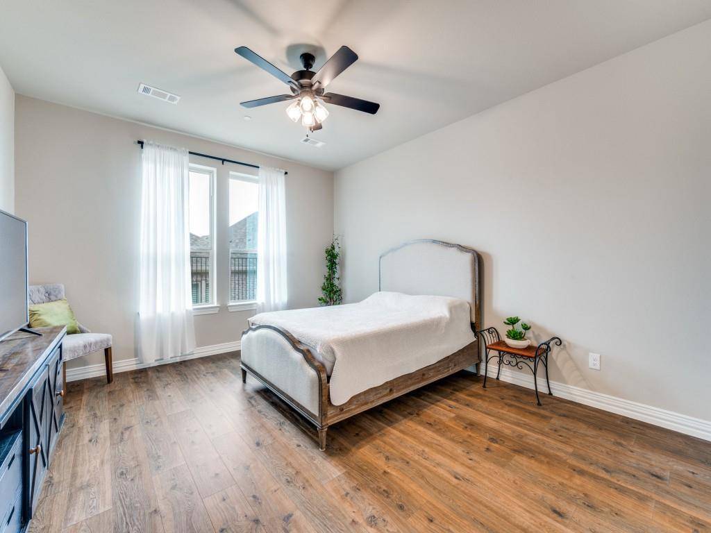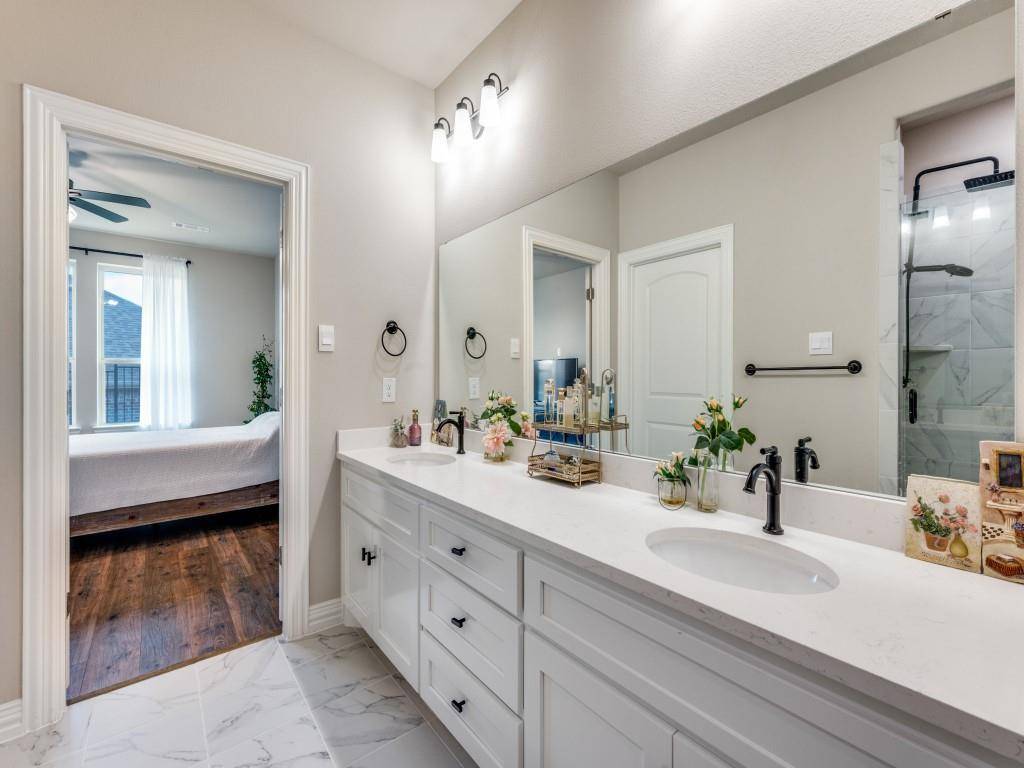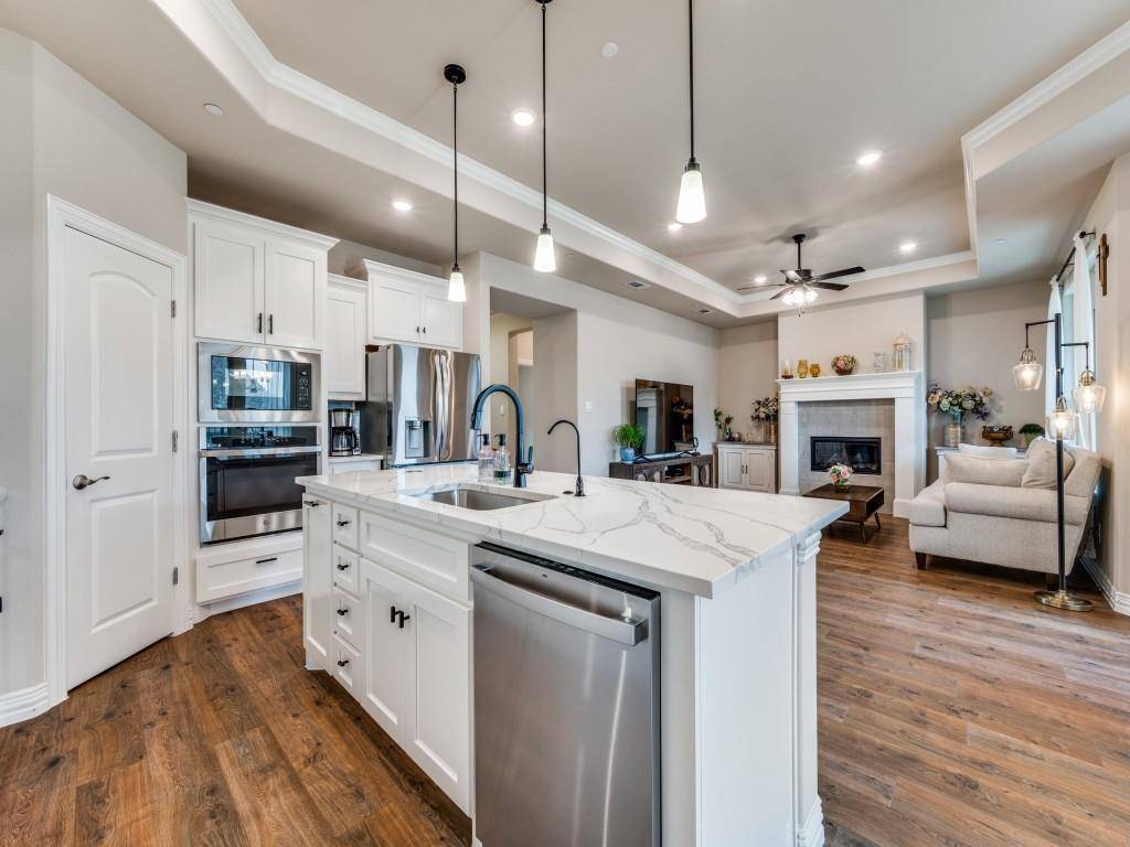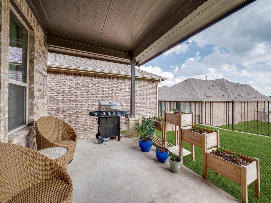 Welcome to a beautifully designed, move-in ready home located in the premier 55+ active adult community of Ladera at Prosper. This stunning residence showcases the popular Salerno floor plan, offering an elegant blend of comfort, functionality, and modern design. Step inside to experience a bright, open-concept layout highlighted by dramatic tray ceilings and abundant natural light. The spacious living and dining areas seamlessly connect to a large covered patio, perfect for relaxing or entertaining, with potential for extended outdoor living. The thoughtfully designed eat-in kitchen features ample space for gathering and flows effortlessly into the main living area. The home's unique “living line” layout offers exceptional convenience, connecting the primary bedroom to the spa-like bathroom, walk-in closet, and utility room for efficient everyday living. This home is loaded with upgrades, including whole-house water softener, and enhanced double insulation for improved energy efficiency and comfort. Residents of Ladera at Prosper enjoy resort-style amenities, including a clubhouse, fitness center, yoga studio, private meeting spaces, pool, pickleball courts, and scenic walking trails connecting to the Prosper trail system. Designed for an active and low-maintenance lifestyle, this home offers the perfect blend of luxury, convenience, and community in one of Prosper's most desirable neighborhoods.